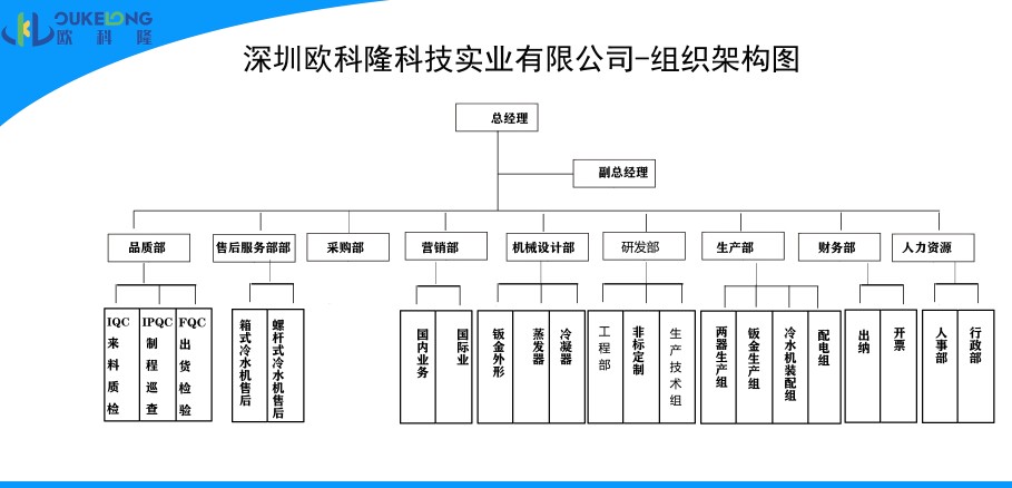 歐科隆制冷總經(jīng)理辦公室下轄九大部門,分別為:品質(zhì)部、售后服務(wù)部、采購部、營銷部、機械設(shè)計部、研發(fā)部、生產(chǎn)部、財務(wù)部、人力資源部。最高行政權(quán)、人事任免權(quán)為總經(jīng)理所有。總經(jīng)理下轄:銷售副總經(jīng)理,副總經(jīng)理。