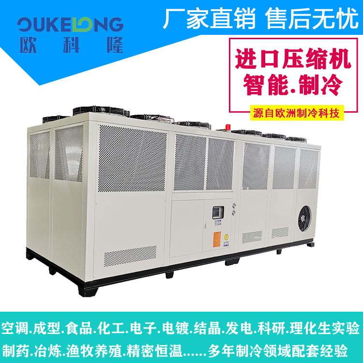 歐科隆150匹風冷螺桿式冷水機是一款工業級大冷量制冷設備,采用高效螺桿壓縮技術,單機冷量達525kW,專為大型工業制程及商業場所設計。機組采用模塊化箱體結構,配備德國比澤爾/漢鐘精機雙螺桿壓縮機,制冷能效比(COP)達3.8以上,溫度控制范圍5~30℃可調。